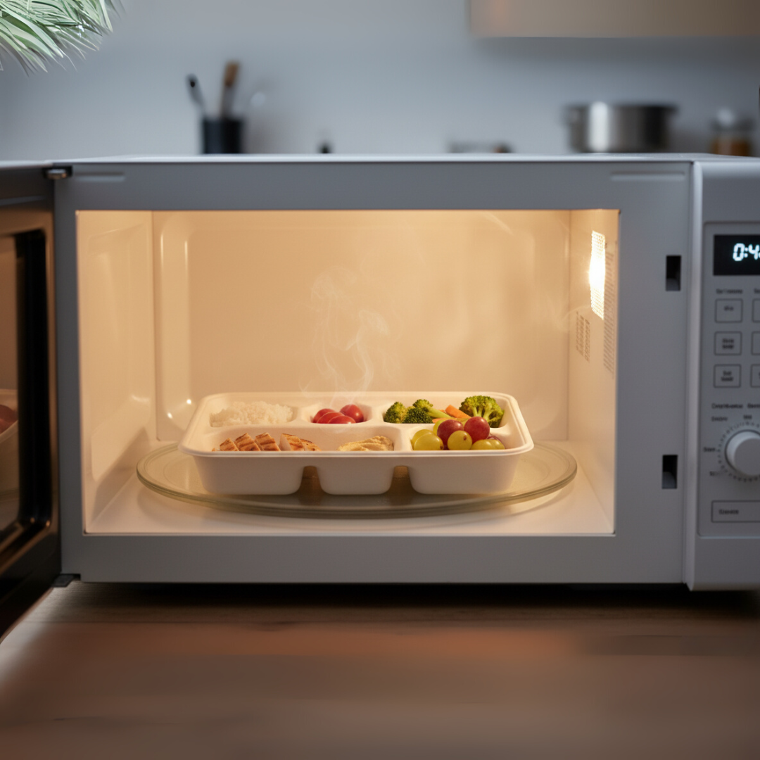Serve meals sustainably with BioGreen 5-compartment sugarcane plates, designed for eco-conscious households, schools, offices, and events. These heavy-duty, disposable trays combine durability, convenience, and environmental responsibility.